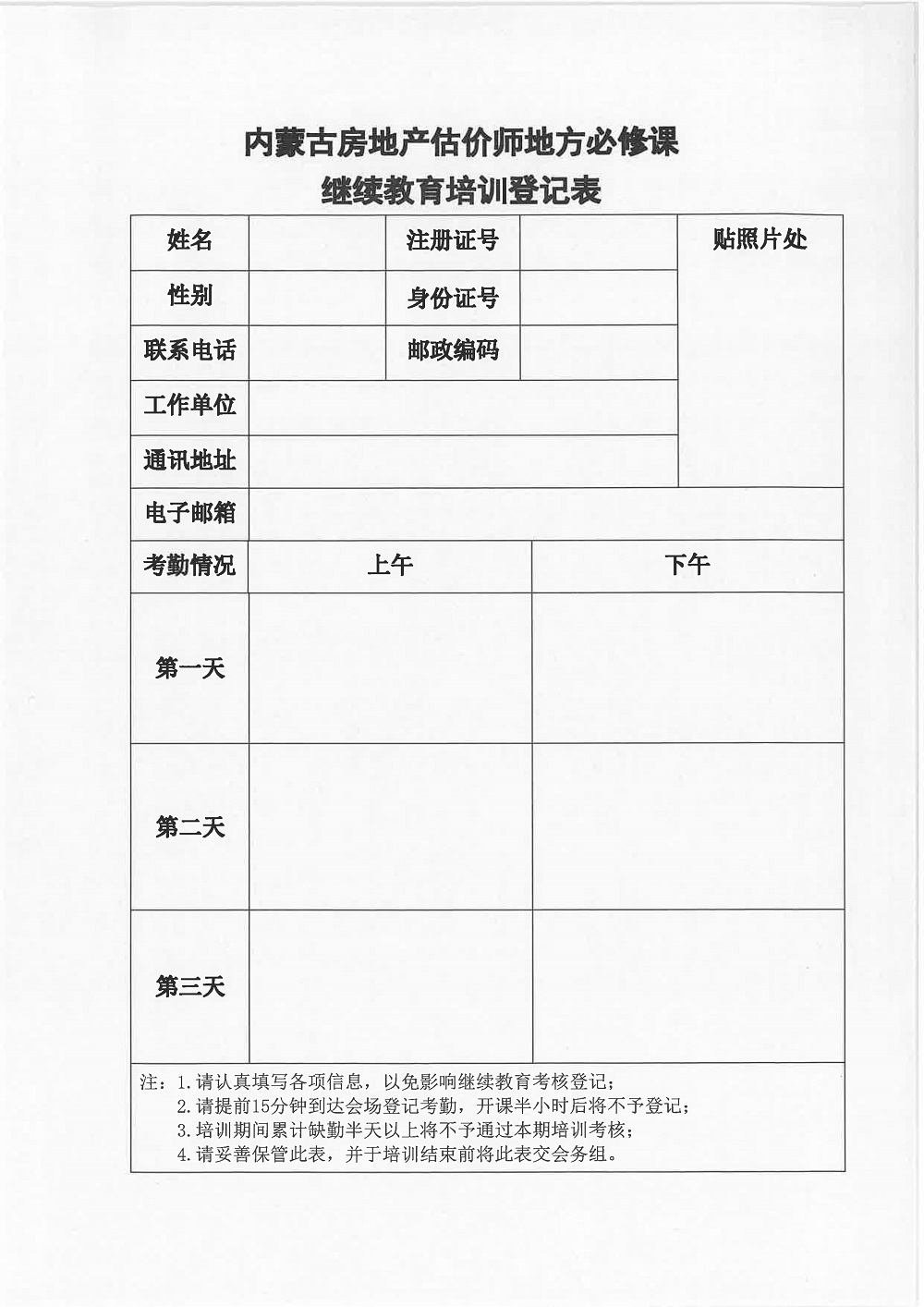 内蒙古房地产估价师地方必修课继续教育培训登记表.doc
